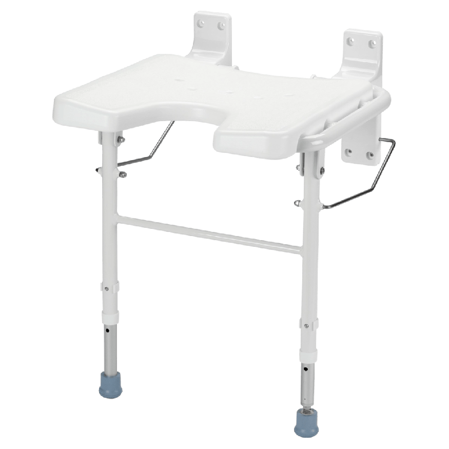 Douchezitje wandbevestiging opklapbaar met hygiëne-uitsparing en steunpoten voor extra stabiliteit. Ruimtebesparend en comfortabel in gebruik.