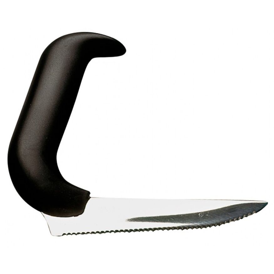 Dit gehoekt mes is ontworpen voor mensen met verminderde mobiliteit in hun handen en armen. De handgreep is ergonomisch en staat gehoekt op het gekartelde mes, waardoor de gebruiker efficiënt gebruik maakt van de kracht in hand en arm tijdens het snijden.